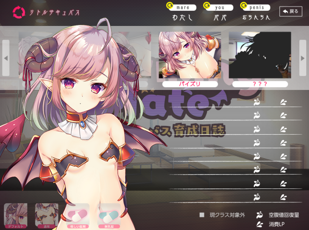 メアちゃんはエッチな経験をすることで成長して行きますが、エッチをやり過ぎるとメアちゃんが暴走して精気を搾り取られてゲームオーバーになってしまうのでバランスを見ながら立派な「サキュバスクィーン」になれるように教育して行きましょう。ゲームは制限時間も無くパラメータを気にしながら行動を選択するするだけなので片手で気楽にプレイできます。